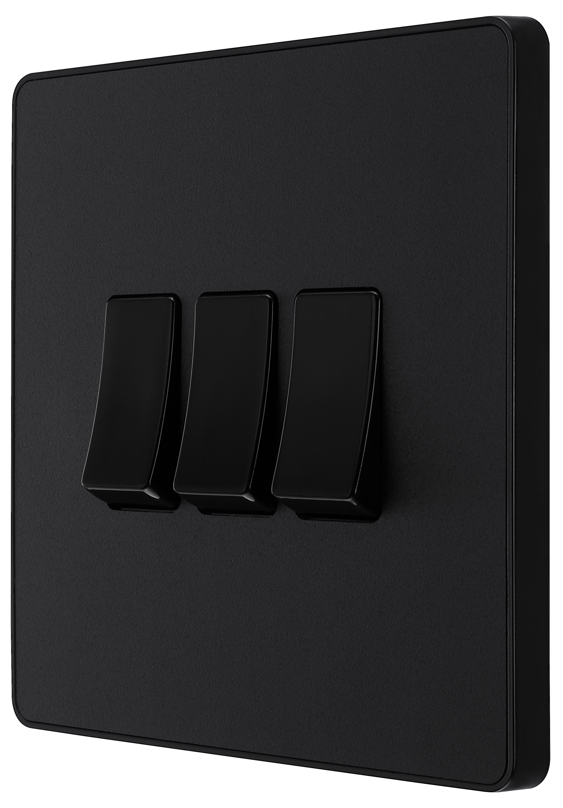 This Evolve Matt Black 20A 16AX triple light switch from British General can operate 3 different lights, whilst the 2 way switching allows a second switch to be added to the circuit to operate the same light from another location (e.g. at the top and bottom of the stairs). This switch has a low profile screwless flat plate that clips on and off, making it ideal for modern interiors.